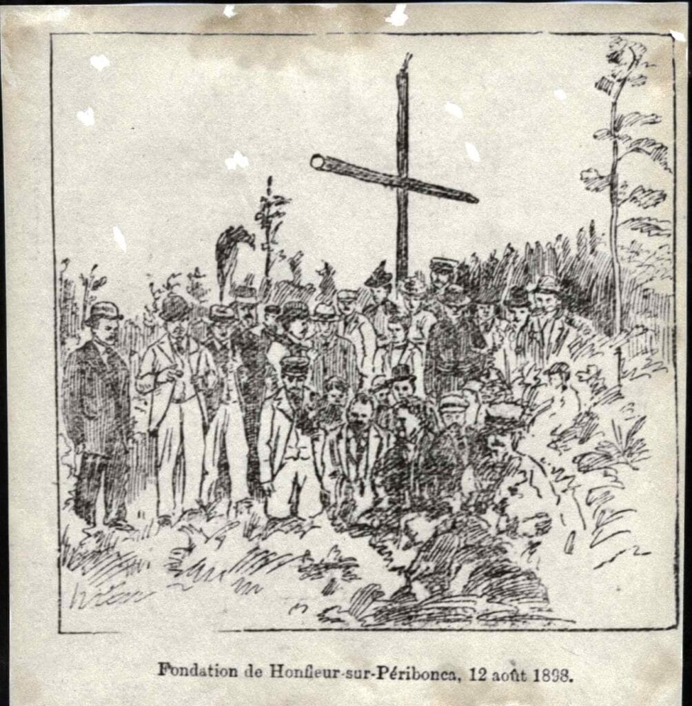 Le nom de Honfleur sonne bien et a une forte saveur historique. Dans quelles circonstances l’a-t-on donné au nouvel établissement ? L’incident ne manque pas d’intérêt. Le 12 août dernier, un groupe de visiteurs, composé de colons, d’agents de colonisation et de touristes, remontait la rivière Péribonca en bateau à vapeur jusqu’au terme de la navigation, au pied de la première des grande chutes que forme cet important cours d’eau.