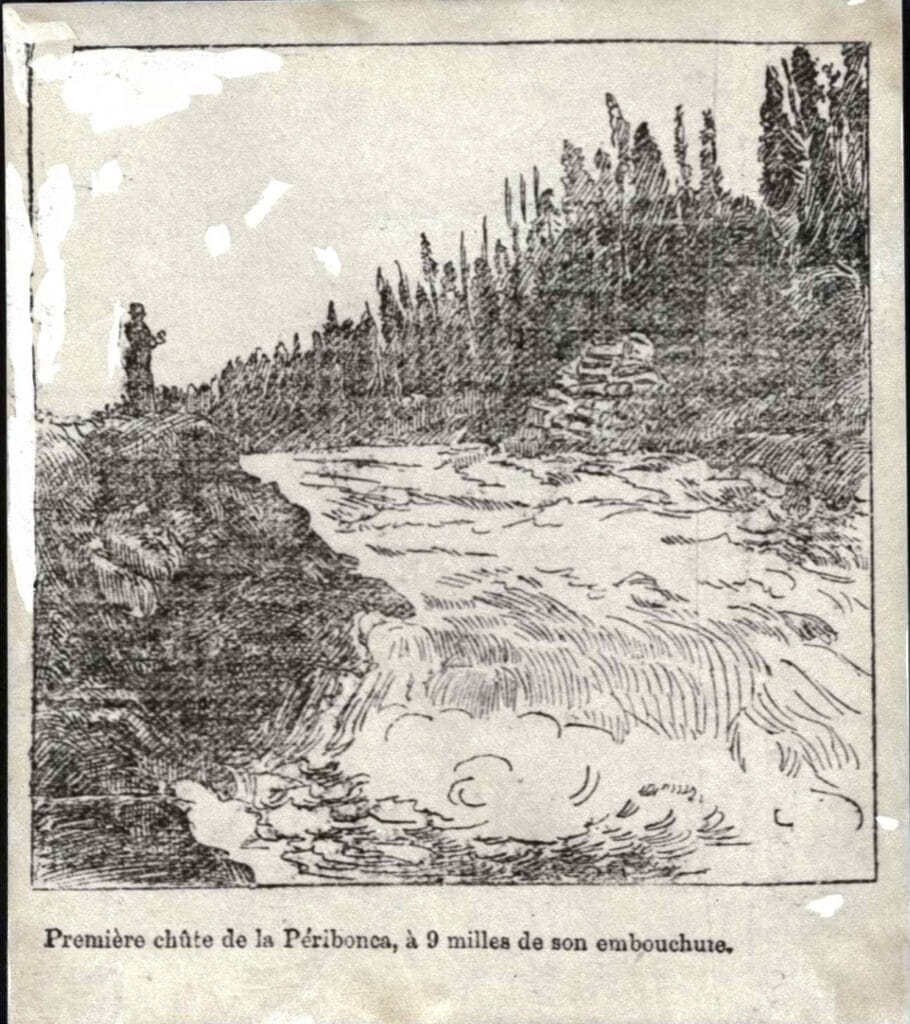 Le commerce de Québec connaît, de son côté, les avantages que lui rapporte l’établissement de chaque nouvelle paroisse du Lac Saint Jean. Au point de vue de l’industrie, l’effet à attendre n’est pas moins important. On parle déjà d’établir une féculerie dans ces nouveaux cantons. les chutes d’eau énormes de la Péribonca msont des sources d’énergie qui ne peuvent longtemps rester improductives dans cette époque de progrès électrique. Celle que représente l’une de nos gravures est évaluée à 29,000 chevaux ; elle est accessible par bateau à vapeur. Au pied de cette chute, la rivière a une largeur d’un quart de mille.