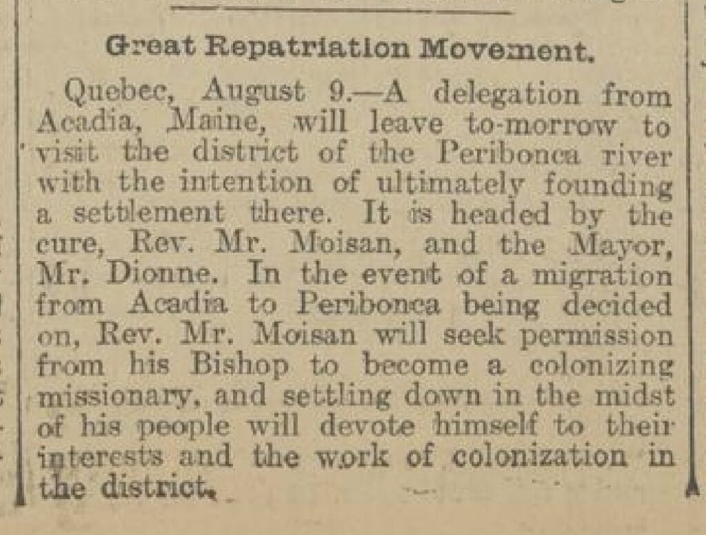 Great Repatriation Movement. Quebec, August 9.—A delegation from Acadia, Maine, will leave tomorrow to visit the district of the Peribonca river with the intention of ultimately founding a settlement there. It is headed by the cure, Rev. Mr. Moisan, and the Mayor, Mr. Dionne. In the event of a migration from Acadia to Peribonca being decided on, Rev. Mr. Moisan will seek permission from his Bishop to become a colonizing missionary, and settling down in the midst of his people will devote himself to their interests and the work of colonization in the district.